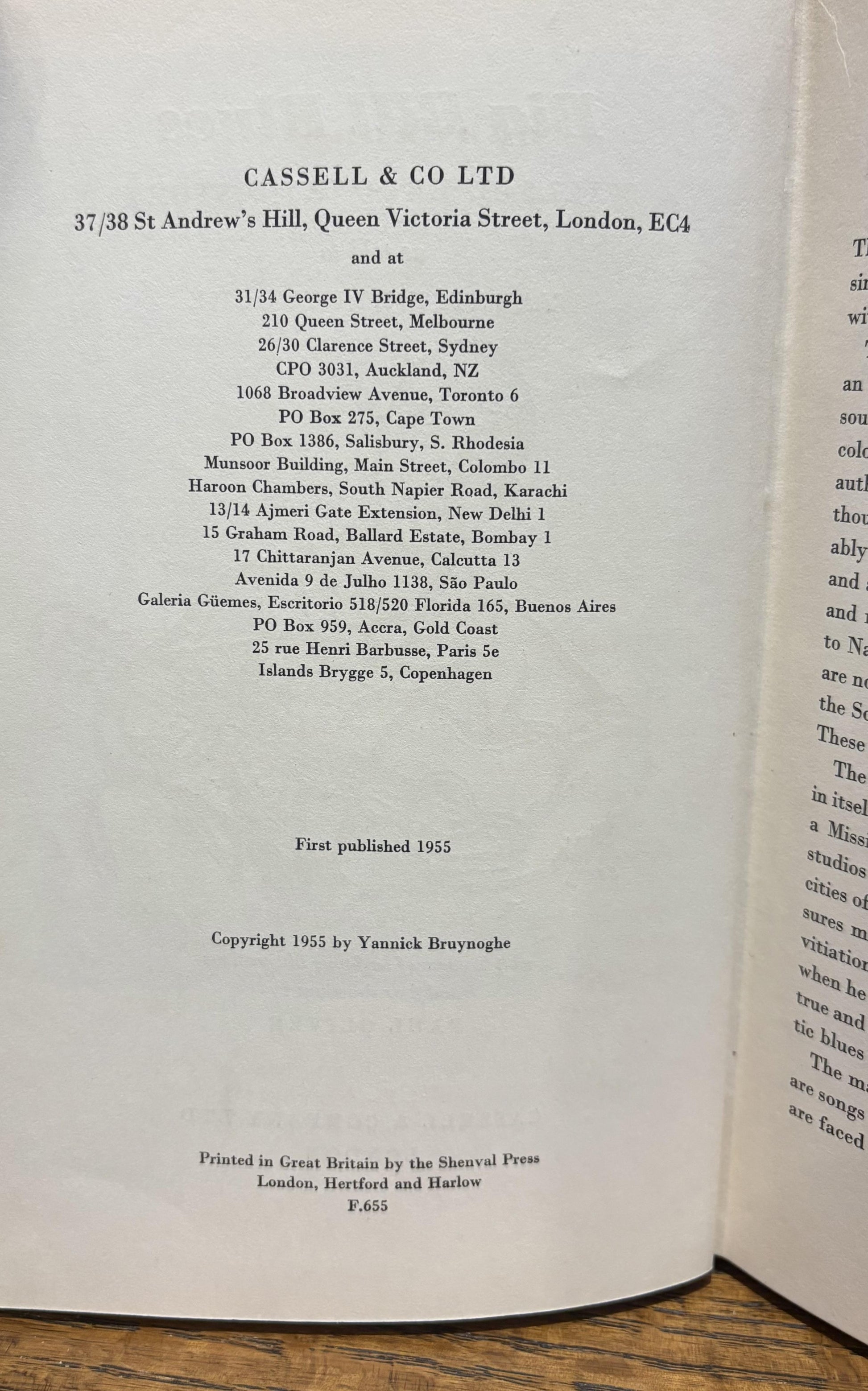 First UK edition, published in English by Cassell in 1955.Very good in publisher's brown cloth, gilt stamped titles to spine. No jacket. Spine ends slightly pushed, very slight lean to spine. Foxing to edges of text block. Includes 9 pages of half-tone photographs and 4 drawings by Paul Oliver.