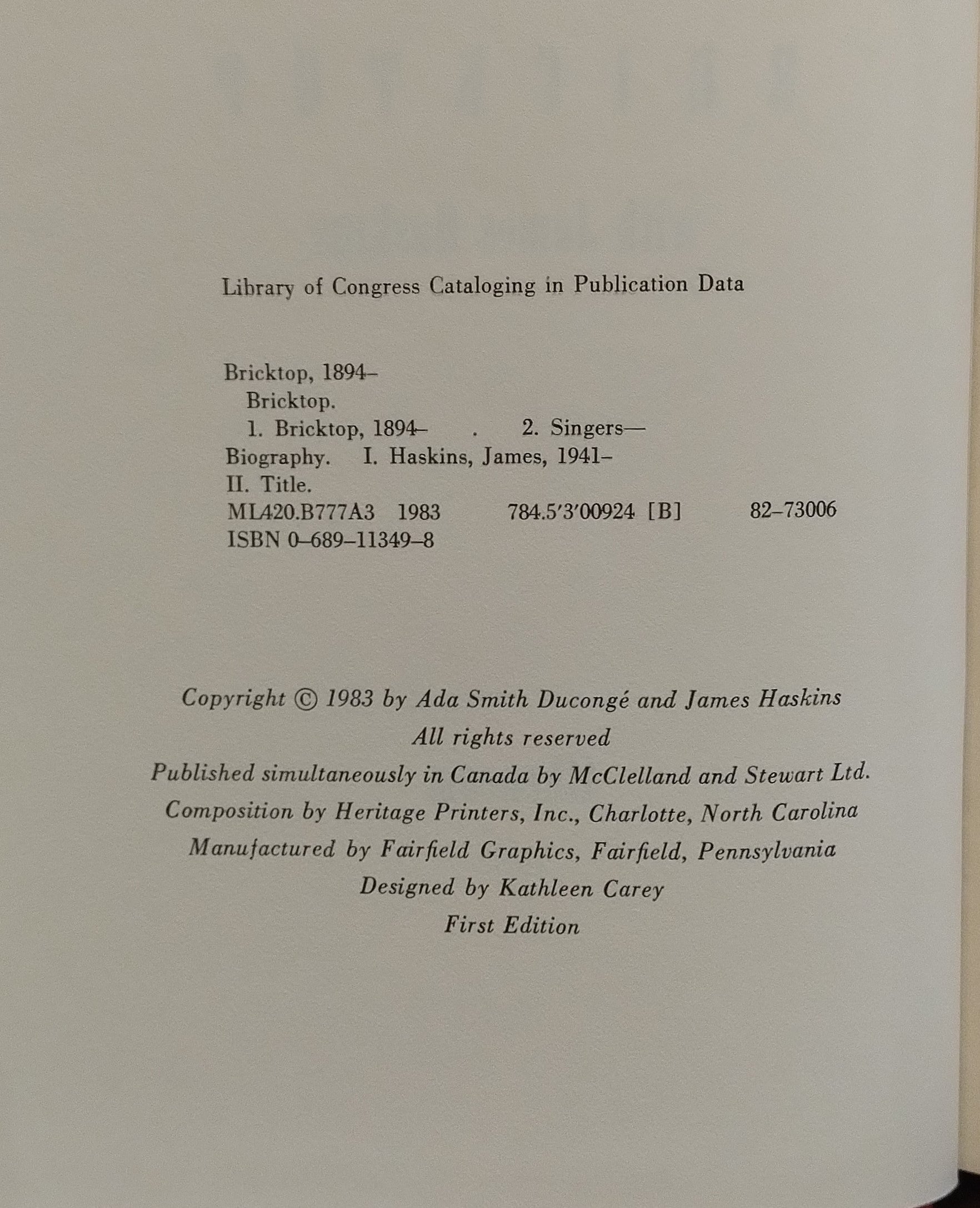 Near fine first edition. Binding square and tight. Pages clean and unmarked. Slight wear to ends of spine. Near fine dust jacket. Not price-clipped. Slight wear to ends of spine. Two small closed tears to bottom of spine. Minor crease to bottom of back cover. A lovely first edition of the autobiography of Ada "Bricktop" Smith, the internationally known jazz singer, dancer, and owner of successful nightclubs including the legendary Chez Bricktop, which she ran in Paris from 1924 to 1961. 13710
