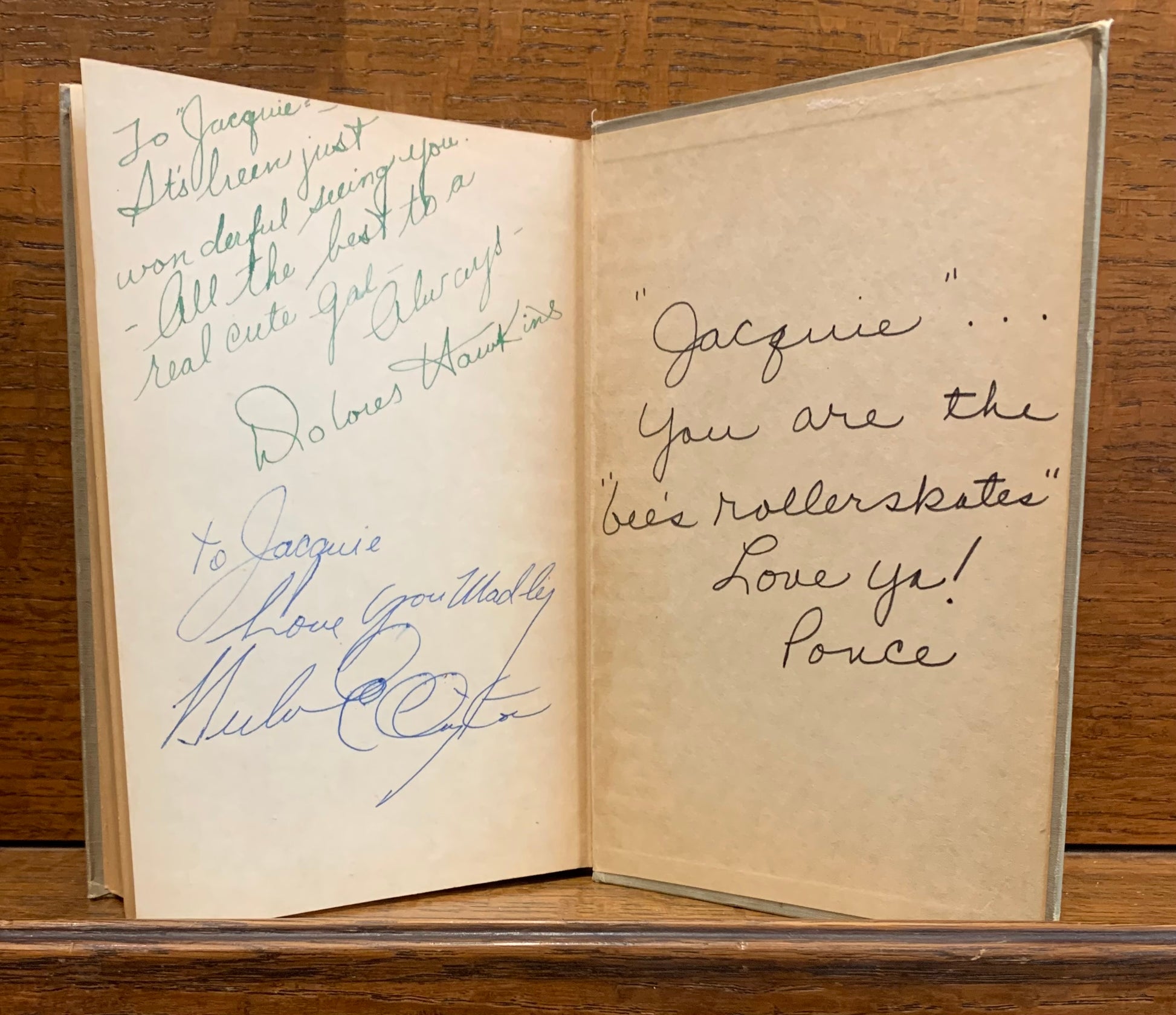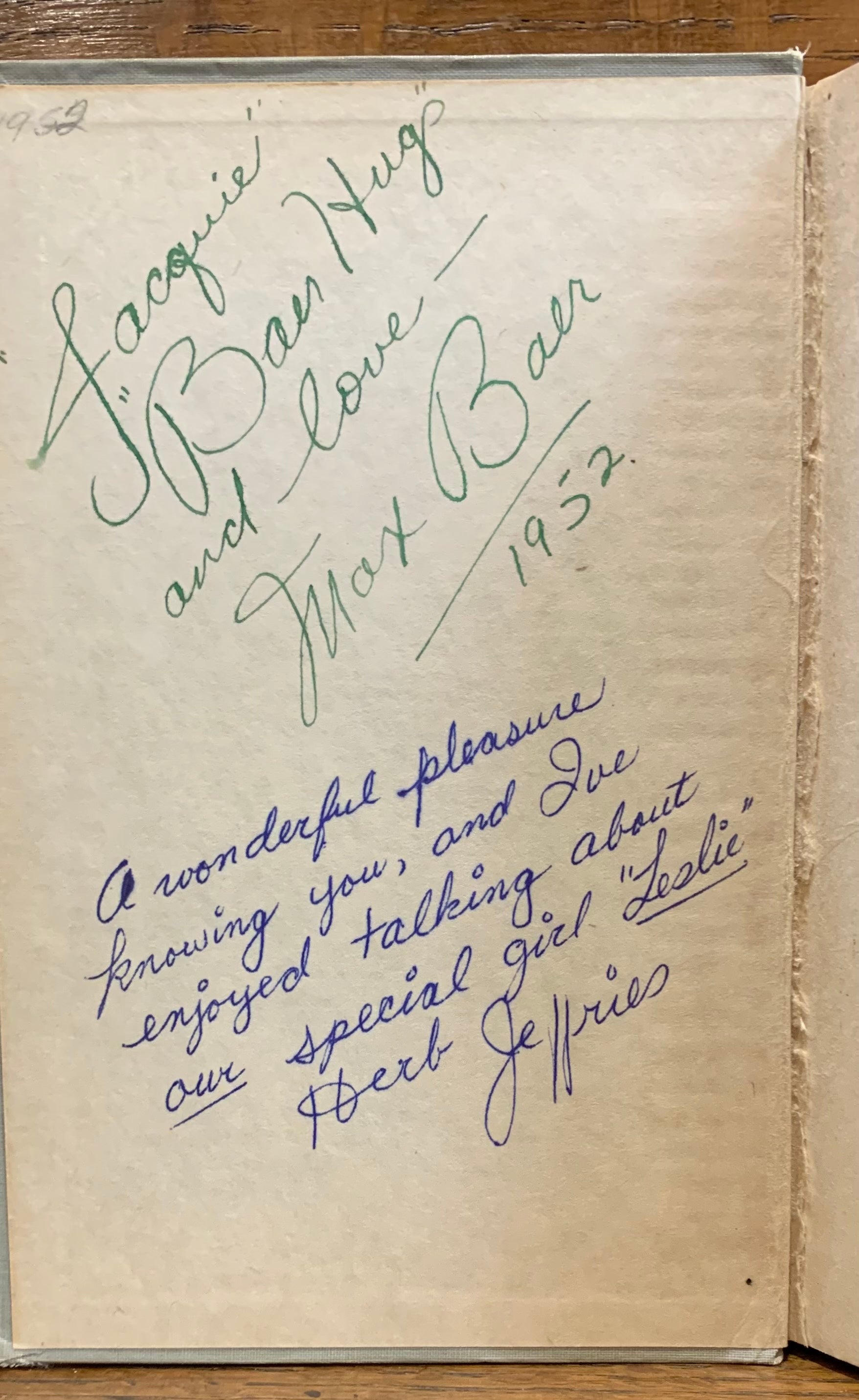 Good early reprint of the famous and, at the time, somewhat controversial look at the early days of jazz, jazz musicians, and the big band era. No publication date give other than 1939, the year of first publication. Probably 1945. Wear to spine ends and extremities. Age toning to spine. Front end paper has been torn out. Pages clean and unmarked. Binding still square and tight. Jacket fair with overall wear and some areas of loss. Book inscribed on the inside front and back covers and rear end paper, by an interesting variety of celebrities: boxer Max Baer, singer Herb Jeffries, singer Dolores Hawkins, as well as someone with an indecipherable signature and the mysterious Ponce. The inscriptions are all to "Jacquie", quite probably singer Jacqueline Fontaine, who co-starred with Baer in the 1951 film "Skipalong Rosenbloom". Not quite lovely but still intriguing copy of an important book. 13696