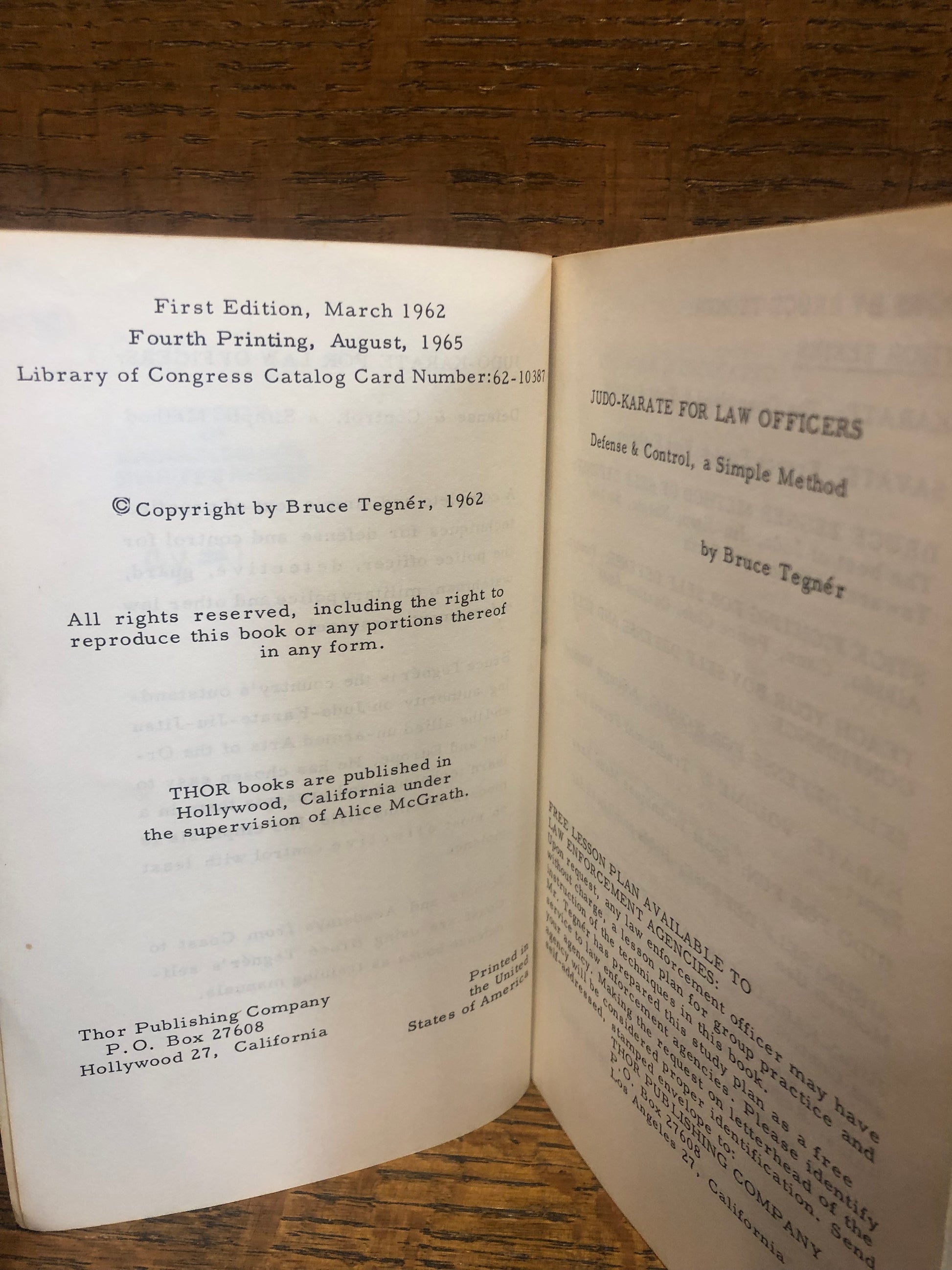 Fair to good fourth printing. Identification plate from previous owner (Madison County Sheriff's Reserve) on inside of front cover. Pages clean and bright. Fading to front cover. Creasing to spine. Minimal area of loss to spine (1cm or less). Faint discolouration to back cover. Written by Bruce Tegner, judo and karate black belt.