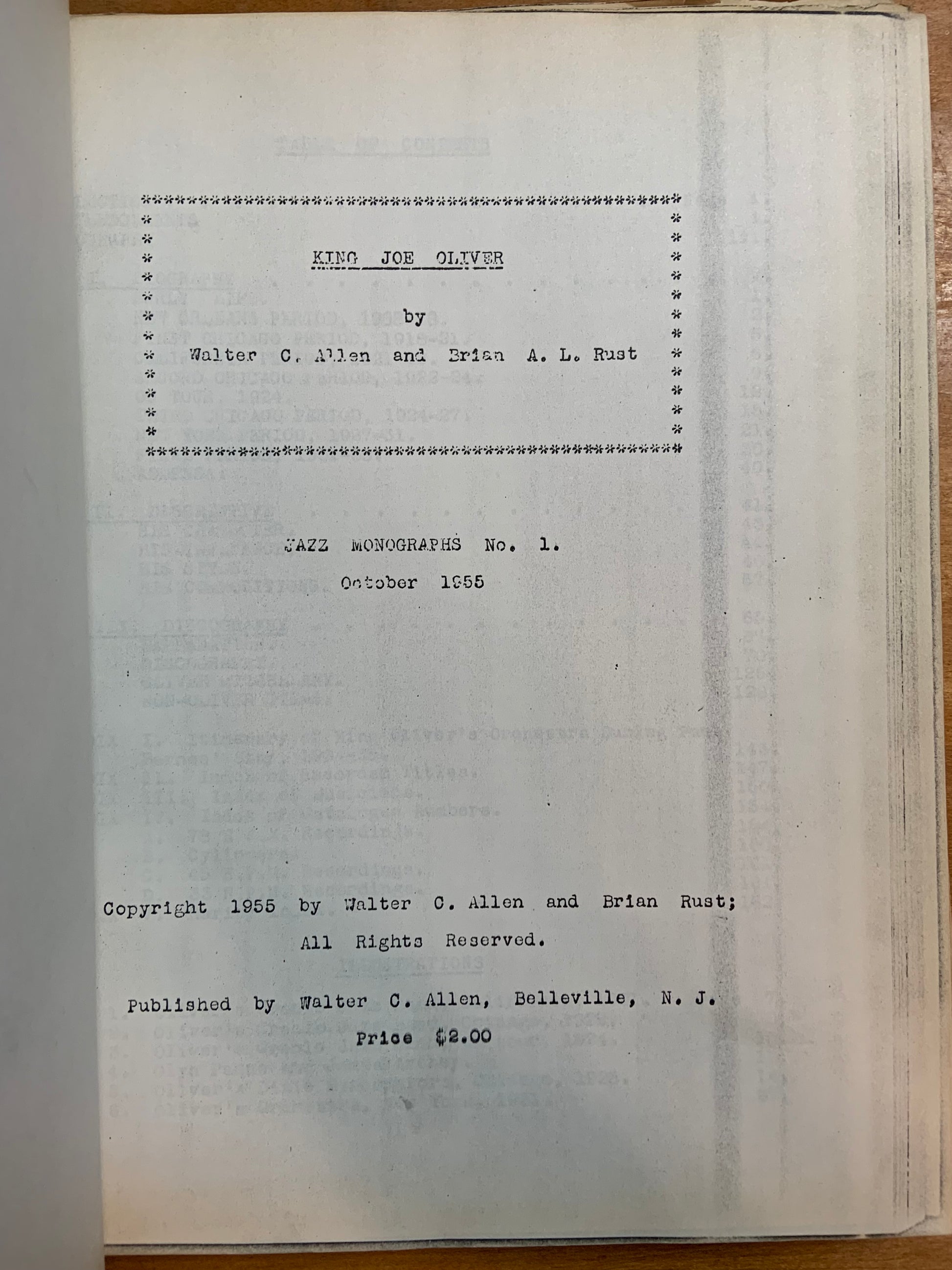 Jazz Monographs No. 1. This is a manuscript copy of Allen and Rust's excellent look at the life, work, and recordings of the great jazz cornet player, bandleader, and composer. 162 mimeographed pages in a black binder. Very good copy with minor wear. Label attached to spine of binder with some loss but title and authors' names intact. Very scarce. 12635