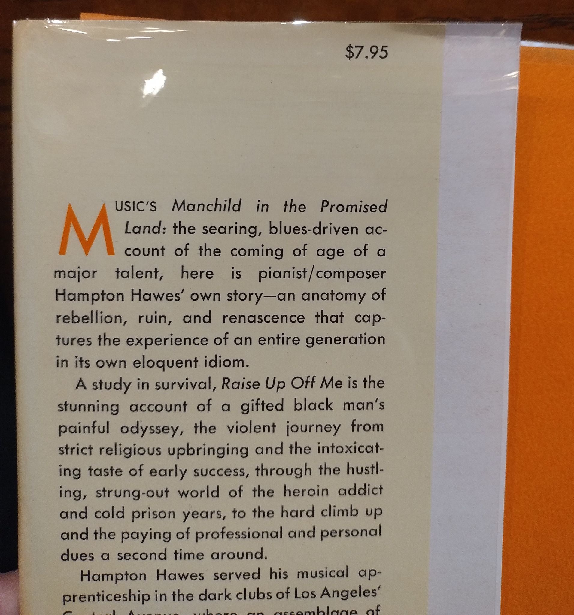 Near fine first edition. Binding square and tight. Pages clean and unmarked. Some bumping to spine ends. Very good jacket. Not price-clipped. Some age toning. Rubbing to back cover. Some light wear to spine ends and edges. An uncommon first edition of Hampton Hawes' notable memoir. 13491