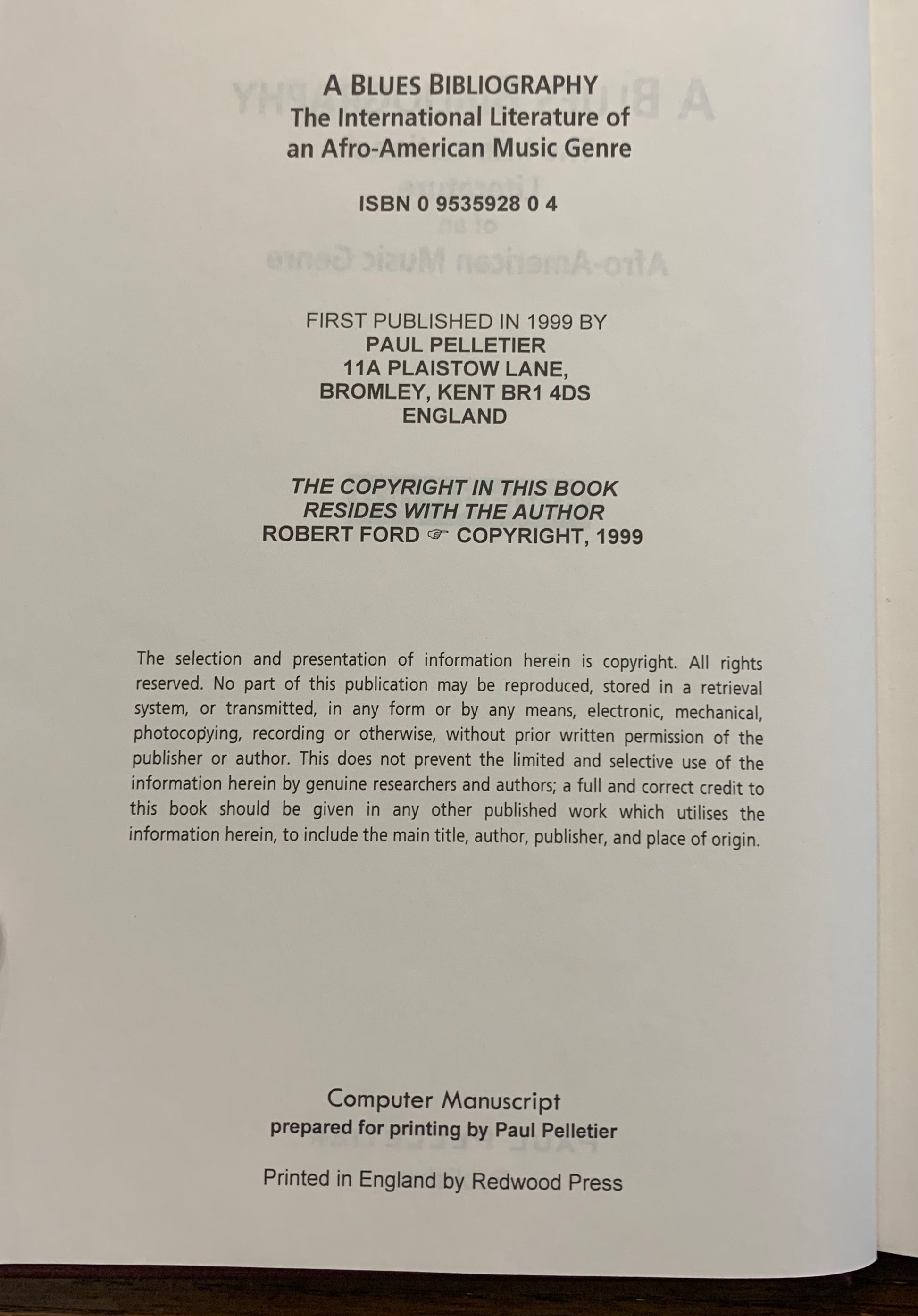 Fine first printing. Publisher's burgundy cloth with silver stamped to spine and front cover. No jacket, as issued. Binding square and tight. Pages clean and unmarked. Minor creasing to edges of some pages between 464 and 538. A vast and comprehensive compilation of books, periodicals/articles, and web sites pertaining to and/or discussing blues music, its history, styles, musicians etc. An essential volume for students, collectors, fans, and practitioners of the blues. 13671