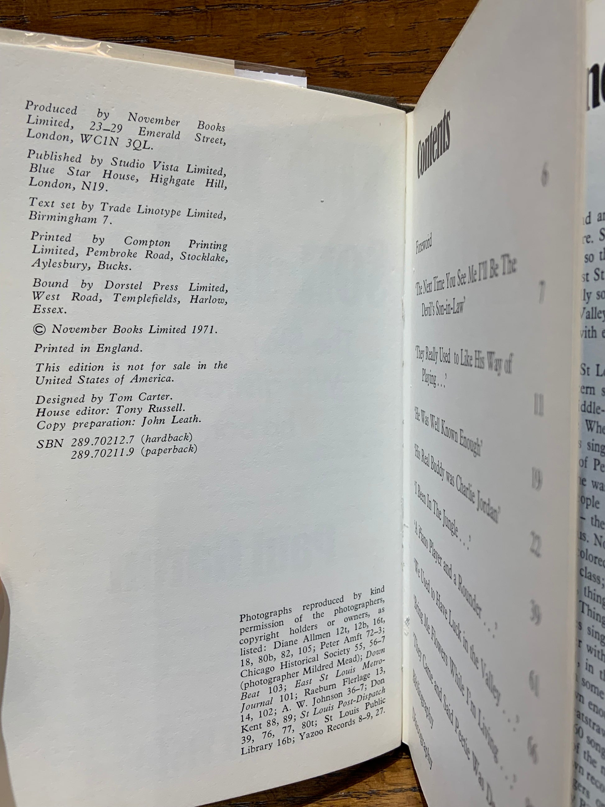 Fine copy in near fine jacket. Hardcover first printing from the Blues Paperbacks excellent series of blues monographs edited by Paul Oliver. Binding square and tight. Pages clean and unmarked. Dust jacket bright and clean. Not price clipped. No tears or creases. Very minor stain to base of spine, otherwise it would be fine. Richly illustrated. Scarce.
