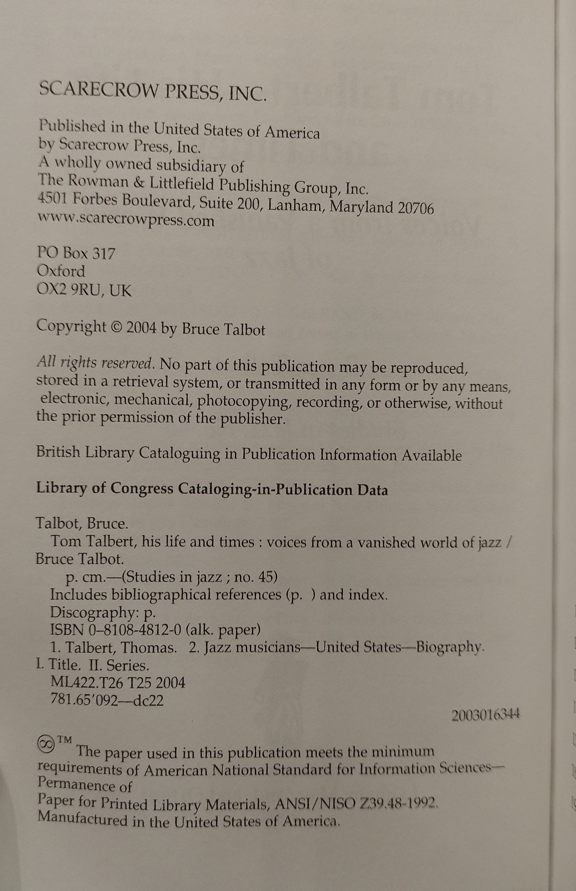 Studies in Jazz # 45. Fine first edition. Clean, square, binding tight. Appears unread. Jacket equally fine. No tears or creases. Includes CD with recordings made by Talbert between 1949 and 1999. 11601